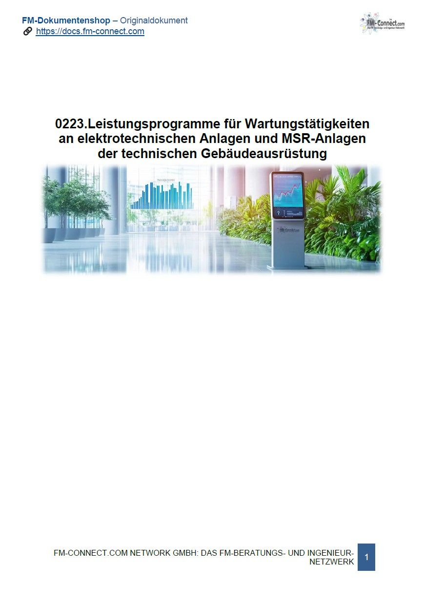 Das Dokument „Leistungsprogramme für Wartungstätigkeiten“ bietet umfassende, tabellarisch strukturierte Leistungsprogramme für die Wartung elektrotechnischer Anlagen, MSR-Einrichtungen, Gebäudeautomationssysteme und Aufzugsanlagen. Es enthält idealtypische Vorgaben zur Erstellung von Wartungsplänen und zur Kalkulation von Wartungskosten. Die Anleitungen orientieren sich an der VDMA-Richtlinie 24186 und berücksichtigen gesetzliche sowie herstellerspezifische Vorgaben. Die Tabellen erfassen detailliert alle Wartungstätigkeiten, Prüfintervalle und Ausführungsarten für verschiedene technische Anlagen im Gebäudemanagement.