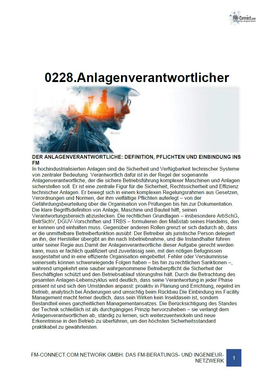 Das Dokument „Anlagenverantwortlicher“ definiert die Rolle und Aufgaben des Anlagenverantwortlichen im technischen Facility Management. Es erläutert die Verantwortlichkeiten für Betriebssicherheit, Instandhaltung und gesetzeskonforme Organisation. Die Inhalte bieten praxisnahe Handlungsempfehlungen, klare Zuständigkeiten und unterstützen bei der Umsetzung von Betreiberpflichten. Ziel ist es, Risiken zu minimieren, Prozesse zu strukturieren und die Einhaltung gesetzlicher sowie normativer Anforderungen sicherzustellen.