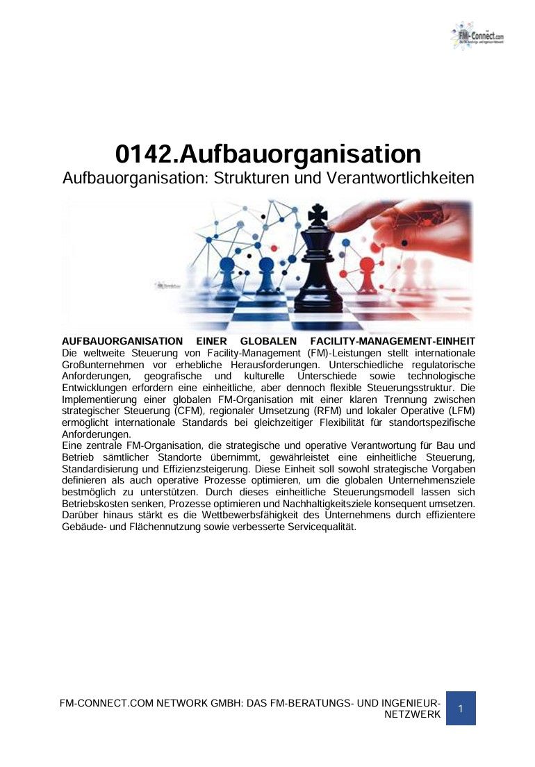 Das Anwendungsdokument „Aufbauorganisation“ legt dar, wie Facility Management strukturell in übergeordnete Organisationsmodelle eingebettet wird, und beschreibt Verantwortlichkeiten und Ebenen wie Corporate Facility Management (CFM), Regional Facility Management (RFM) und Lokales Facility Management (LFM). Es thematisiert die notwendigen Schnittstellen und Abgrenzungen zwischen strategischer, regionaler und operativer Ebene sowie Stabsfunktionen, Sourcing-Modelle, Vergabepakete und typische Aufgabenprofile. An konkreten Beispielen werden Funktionen der zentralen Steuerung, regionalen Anpassung und lokalen Umsetzung verdeutlicht. Ziel ist, eine möglichst effiziente, zukunftsfähige FM-Struktur zu schaffen, die globale Standards ermöglicht und zugleich flexibel auf lokale Gegebenheiten reagiert. Solch eine Struktur fördert Transparenz, Steuerbarkeit und Leistungsfähigkeit im gesamten FM-Netzwerk.