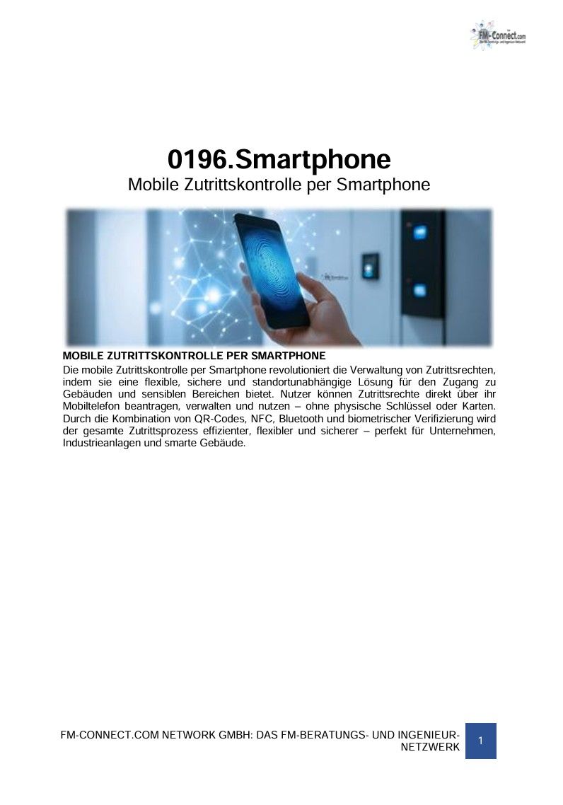 Das Anwendungsdokument „Smartphone” behandelt die mobile Zutrittskontrolle per Smartphone und zeigt, wie QR-Codes, NFC, Bluetooth und biometrische Verifizierung kombiniert werden, um Zutrittsrechte flexibel, sicher und ortsunabhängig zu verwalten. Nutzer können Zutrittsrechte über eine App oder ein Webportal beantragen, temporär oder dauerhaft nutzen, und Türöffnung oder Zugang via Smartphone steuern. Außerdem werden Echtzeit-Protokollierung, Notfall-Überbrückungskonzepte, rollenbasierte Zugriffsmatrix und Sicherheits- und Betriebskonzepte beschrieben. Die Lösung verzichtet dabei auf physische Schlüssel oder Ausweise, reduziert Verwaltungsaufwand und erhöht die Kontrolle – ideal für Unternehmen, Industrieanlagen und smarte Gebäude. Ziel ist eine moderne, digitale Zutrittslösung, die Sicherheit, Flexibilität und Effizienz verbindet.