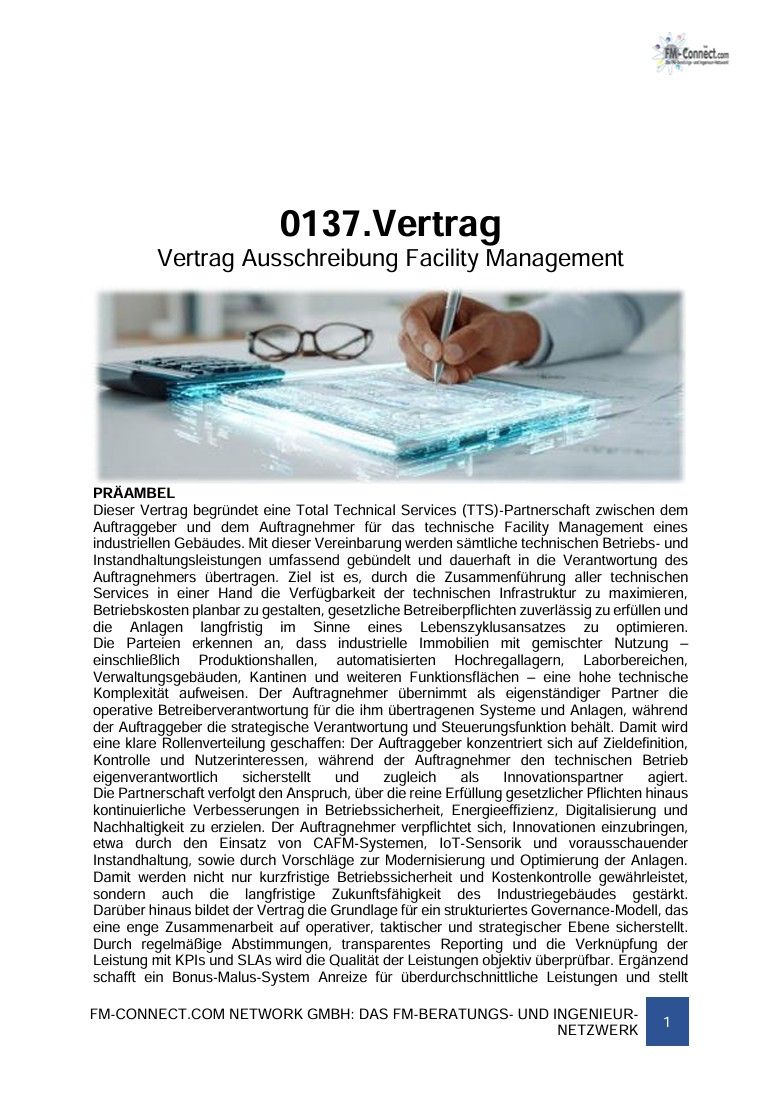 Das Dokument „TTS-Vertrag“ definiert die vertraglichen Rahmenbedingungen für eine Total Technical Services (TTS)-Partnerschaft im technischen Facility Management. Es regelt die Übertragung sämtlicher technischer Betriebs-, Instandhaltungs- und Optimierungsleistungen eines Industrieobjekts auf einen Dienstleister. Der Vertrag legt fest, wie Verfügbarkeit maximiert, Betriebskosten langfristig kalkulierbar gehalten und gesetzliche Betreiberpflichten erfüllt werden. Neben Leistungsumfang, Rollenverteilung und Governance enthält er Regelungen zu Bonus-Malus-System, Change-Management, Digitalisierung (z. B. CAFM, IoT), Innovationsverpflichtungen und Reifegradbewertungen. Ziel ist die Verbindung von operativer Effizienz, Innovationskraft und Nachhaltigkeit, indem der Auftragnehmer als langfristiger Partner agiert und kontinuierliche Verbesserung übernimmt.